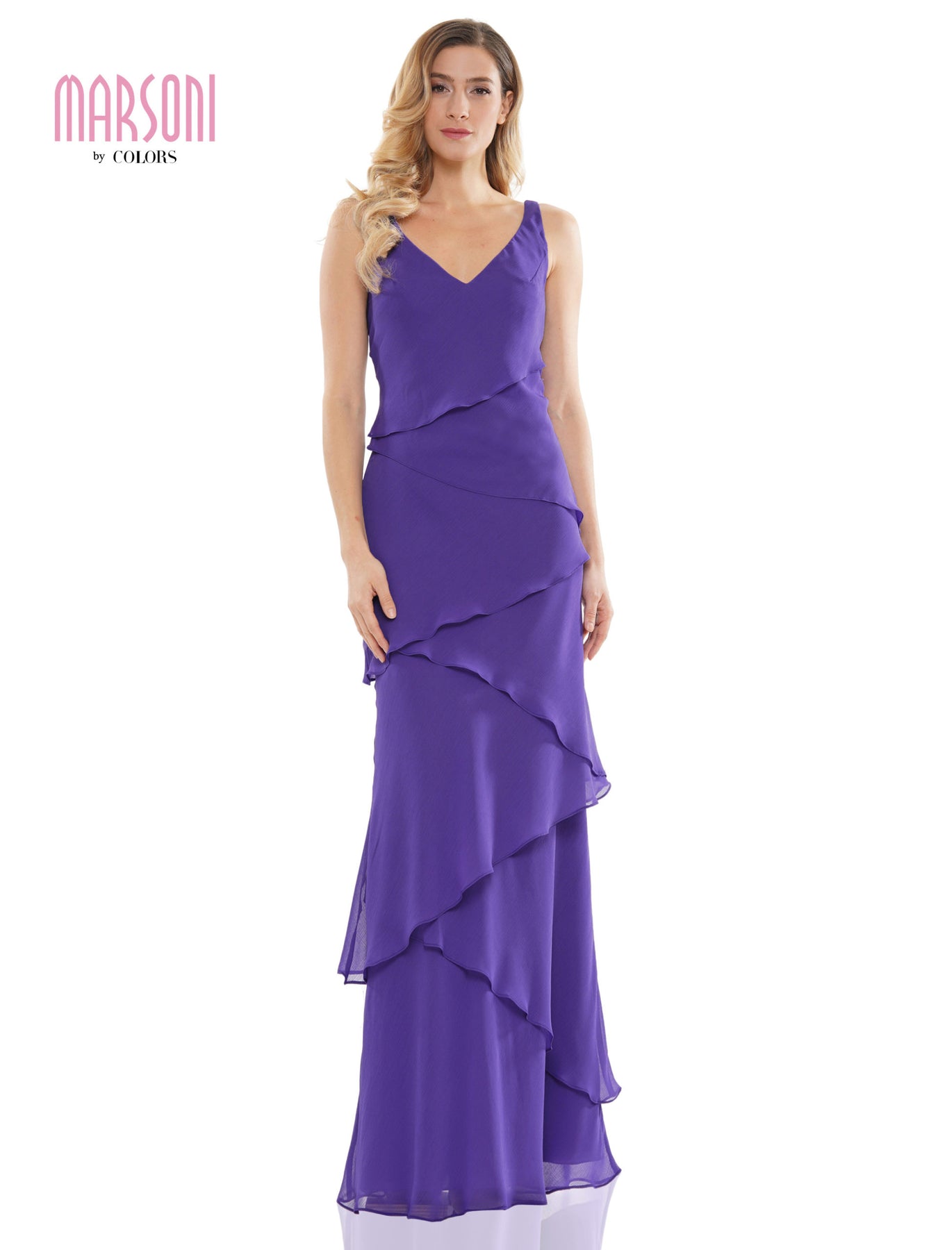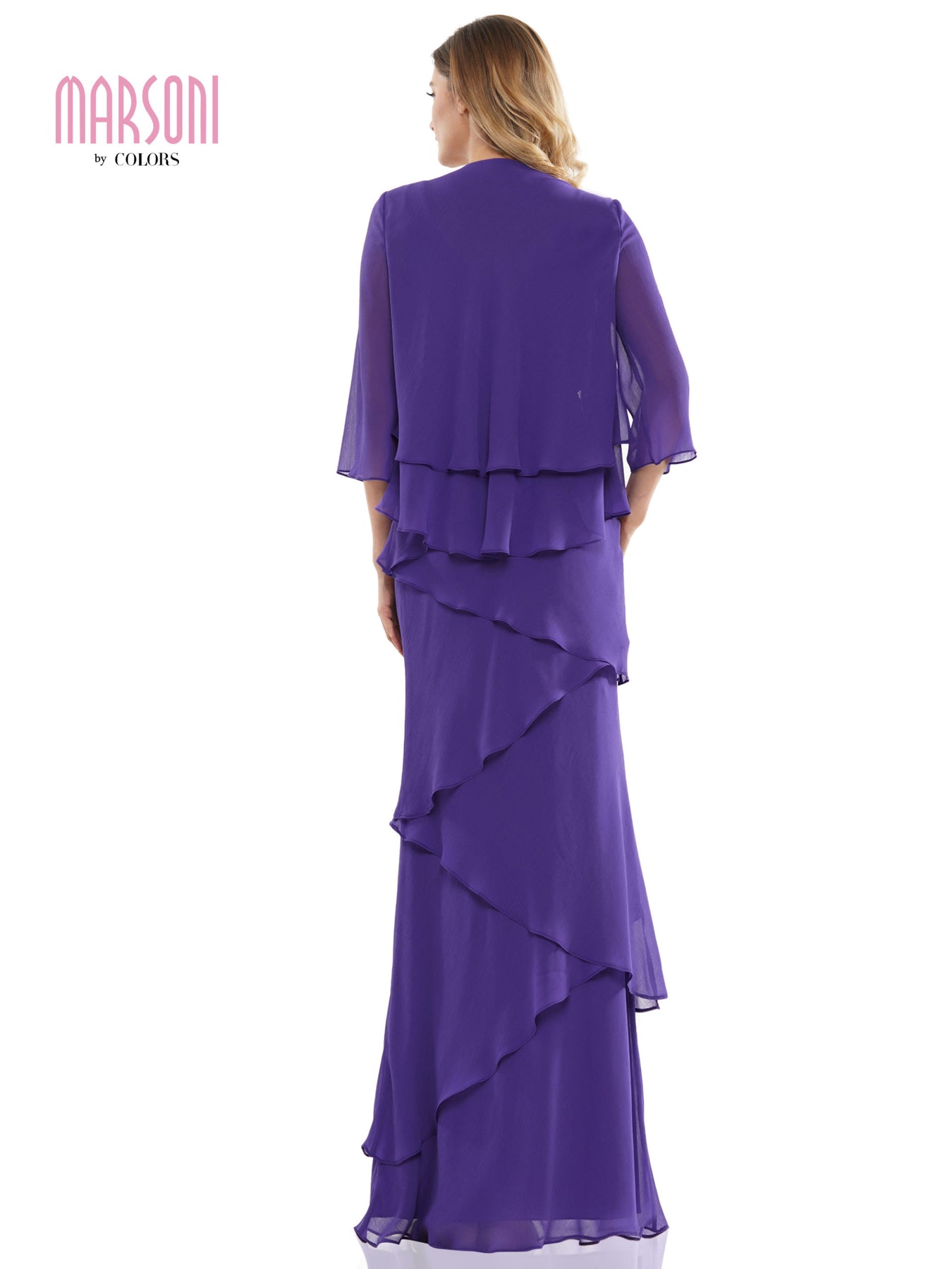 The MARSONI BY COLORS M309 Dress combines elegance and comfort with its crinkle chiffon fabric and flattering fit-and-flare silhouette. Featuring a V-neckline and a ruffle skirt, this dress enhances your natural shape while adding movement and charm. The included jacket offers versatility and a polished finish, making it an ideal choice for a variety of occasions where style and confidence matter.