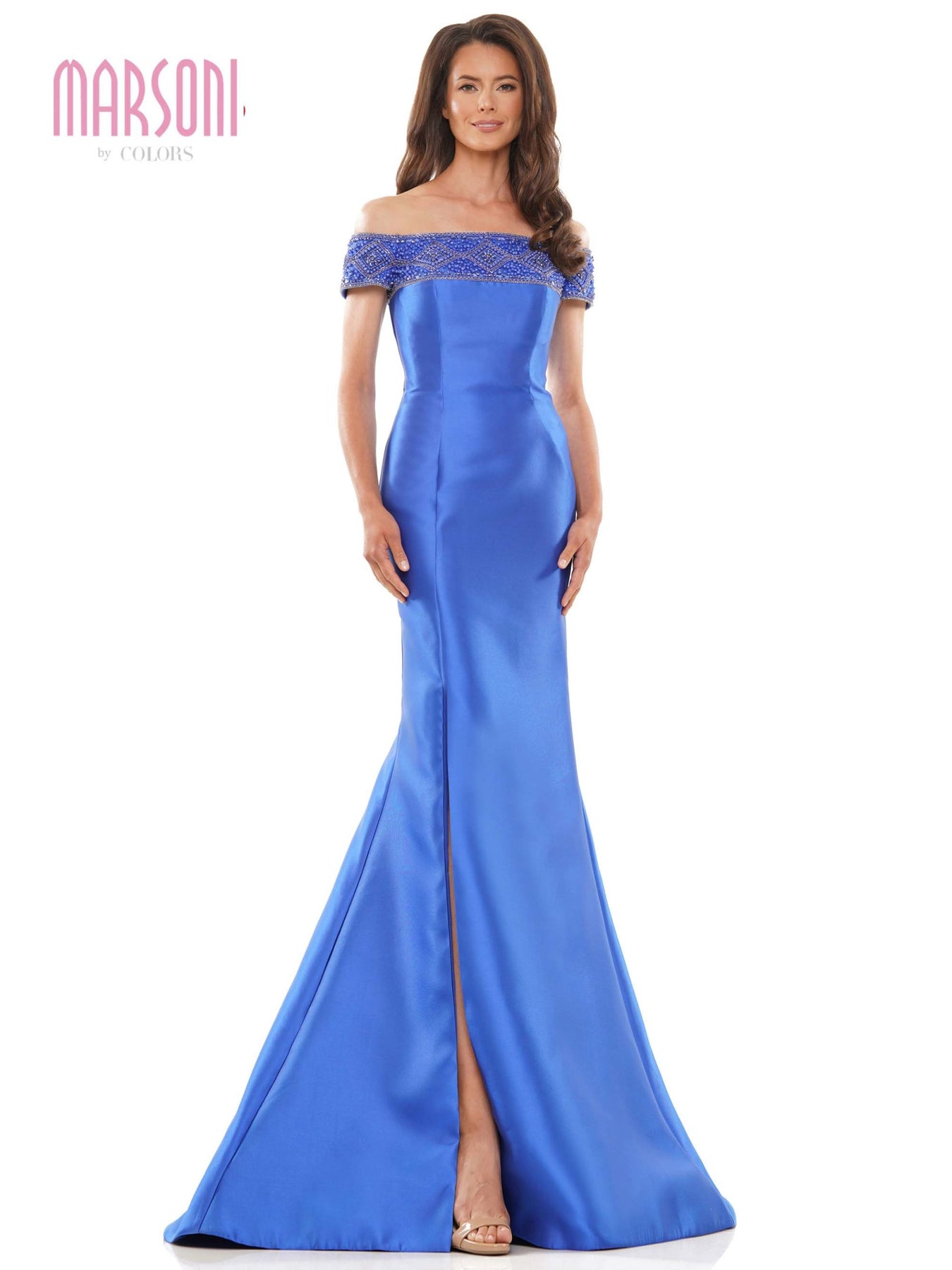 Look stunning in this long fit and flare dress.  This Marsoni by Colors MV1184 features an off the shoulder design, double faced satin fabric with beaded accents around the top, and a knee high slit opening on the left side.