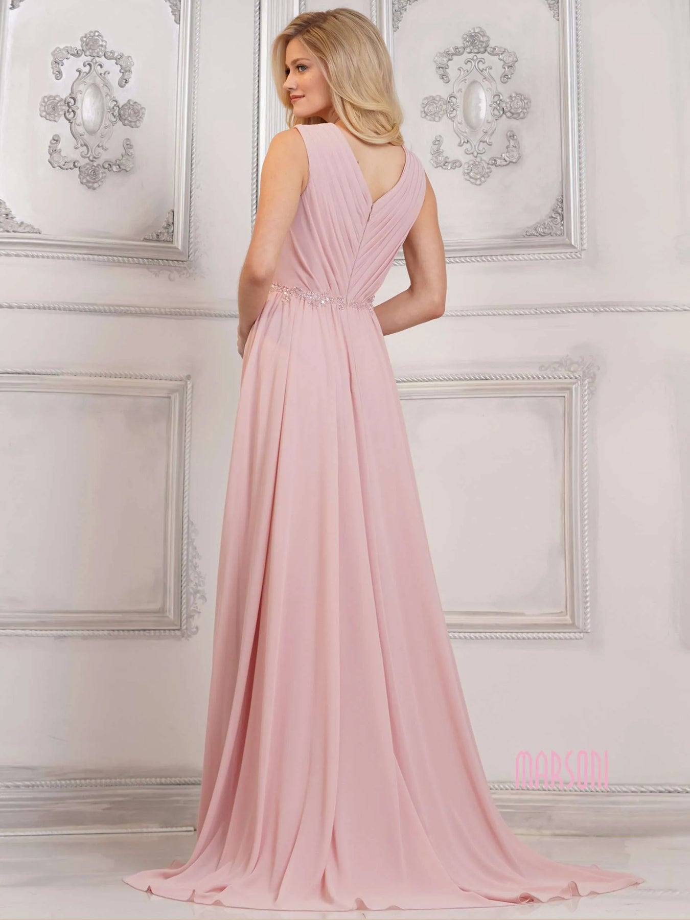Get ready to turn heads in our MV1292 chiffon gown! The V neck, slim A-line silhouette, and gathered bodice and skirt create a stunning, figure-flattering look. The beaded waistline adds a touch of glamour and sophistication. Perfect for any special occasion or event.