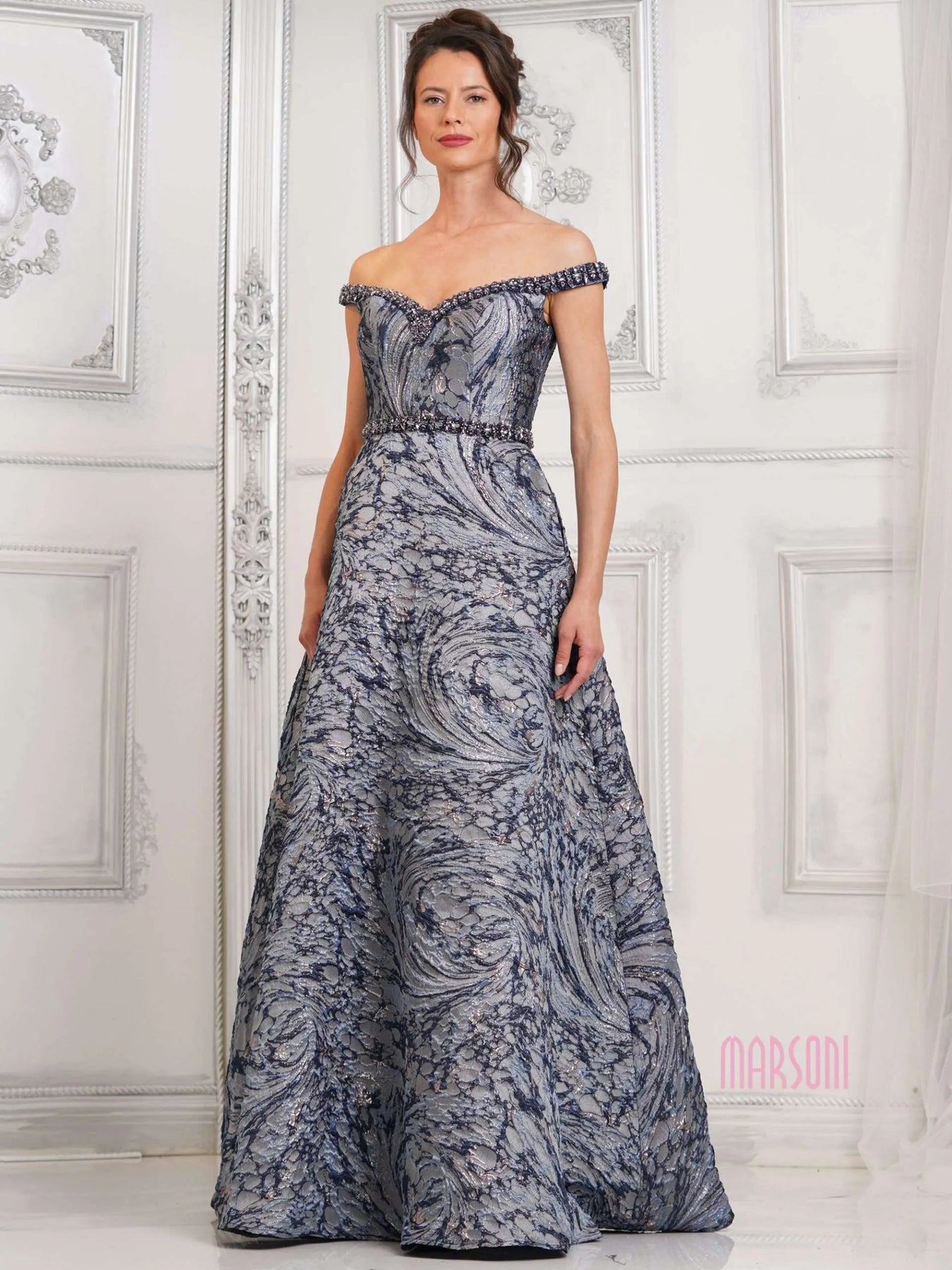 Show off your unique sense of style with the MV1299 gown. This stunning jacquard gown features a trendy off shoulder design and a beautifully beaded neckline, sleeve band, and waistline. Make a statement at any event with this eye-catching and sophisticated dress.