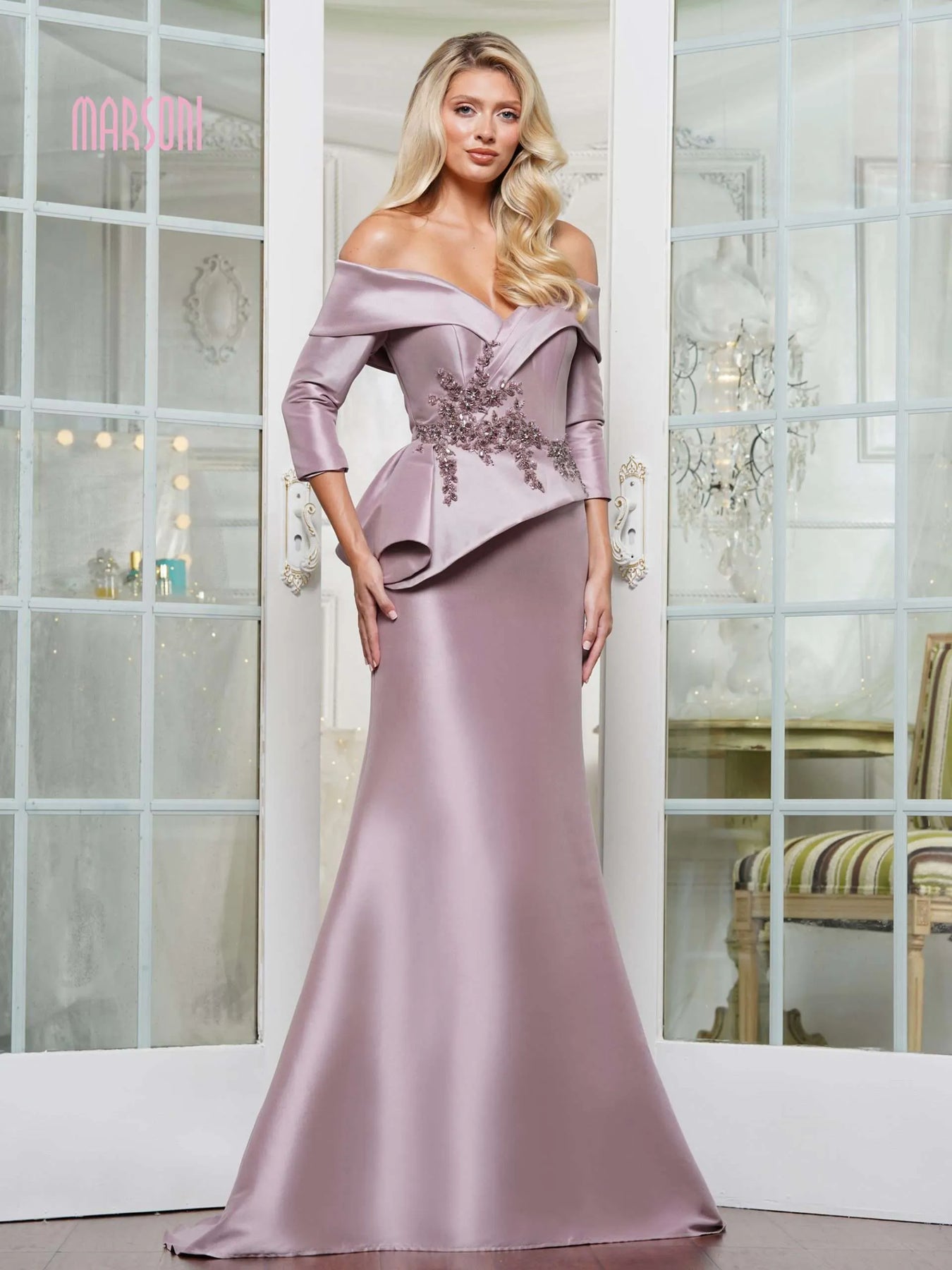 Dazzle on your special day with the Mv1333 dress. The portrait neckline and fit and flare design create a flattering silhouette while a crystal beaded applique adds a touch of elegance. Get ready to turn heads in this stunning, embellished gown.