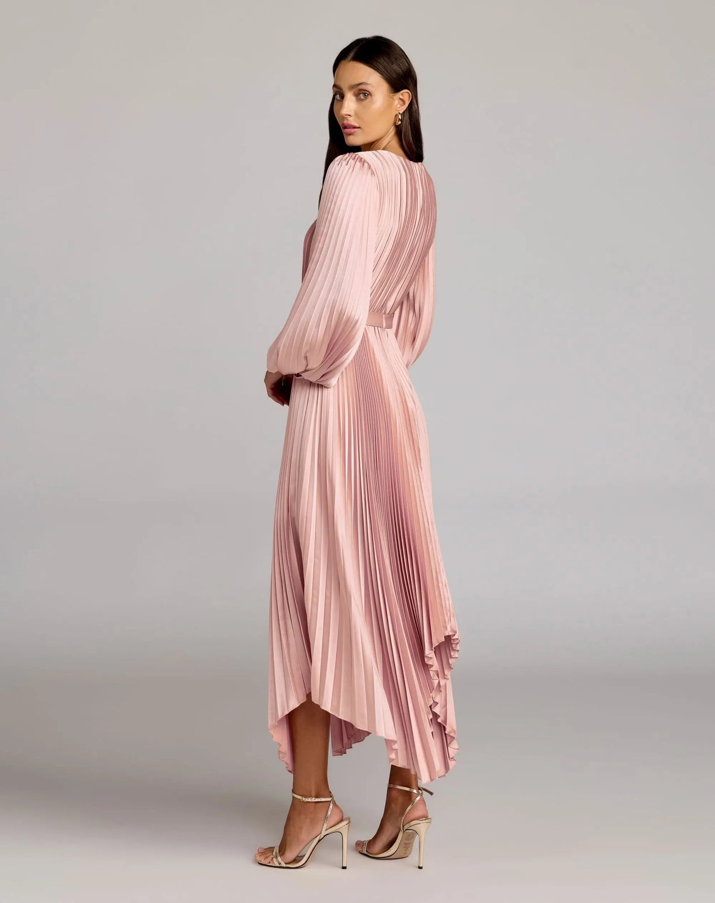 Embrace timeless elegance in this stunning handkerchief dress. Crafted from pleated charmeuse fabric, this dress features a high neckline and long cuffed sleeves, making it the perfect cocktail party or wedding guest dress.