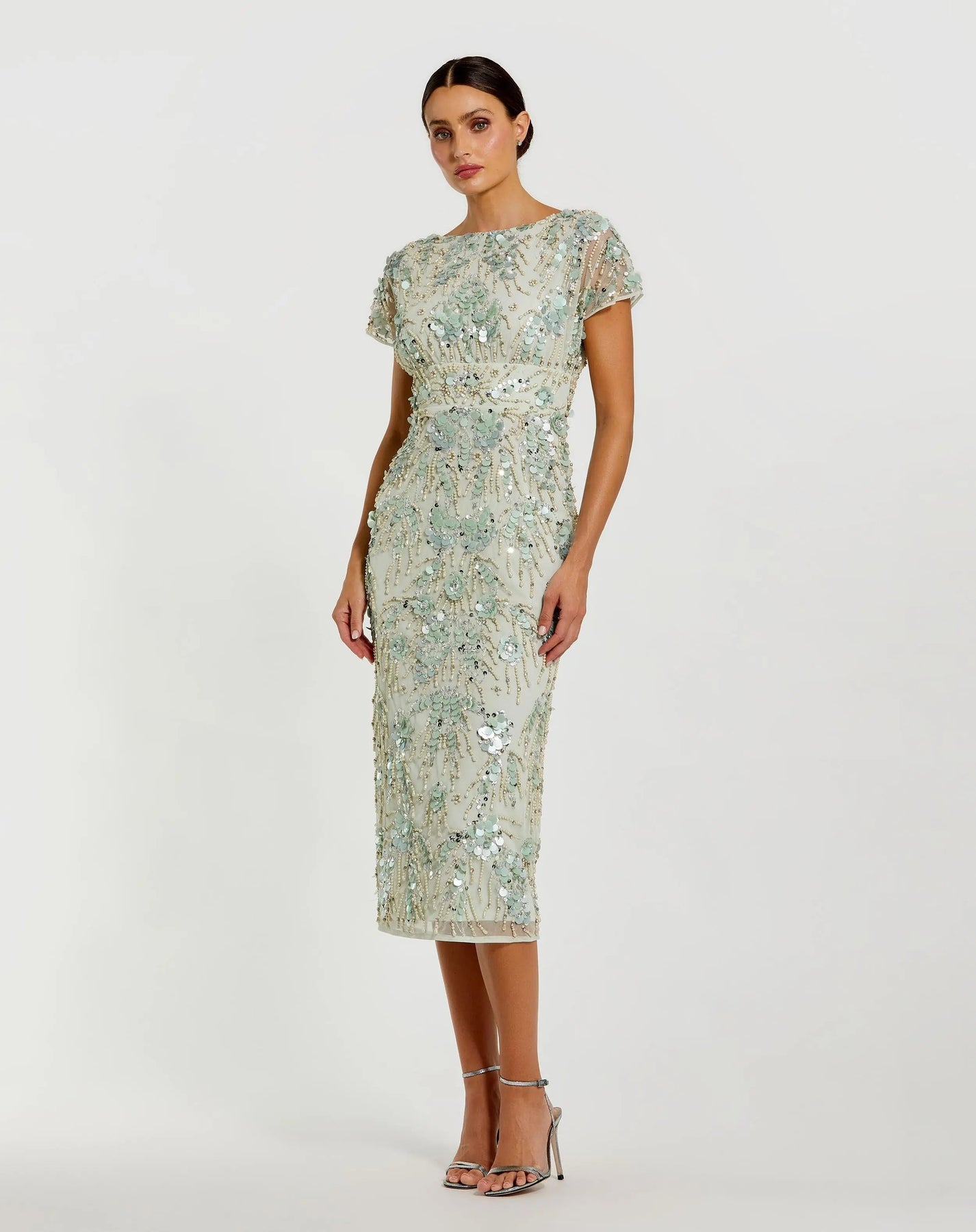 This soft green cocktail dress shimmers with allover pearl, rhinestone, and sequin embellishments. Its delicate sparkle and sleek silhouette create an effortlessly glamorous look, perfect for weddings and cocktail parties.