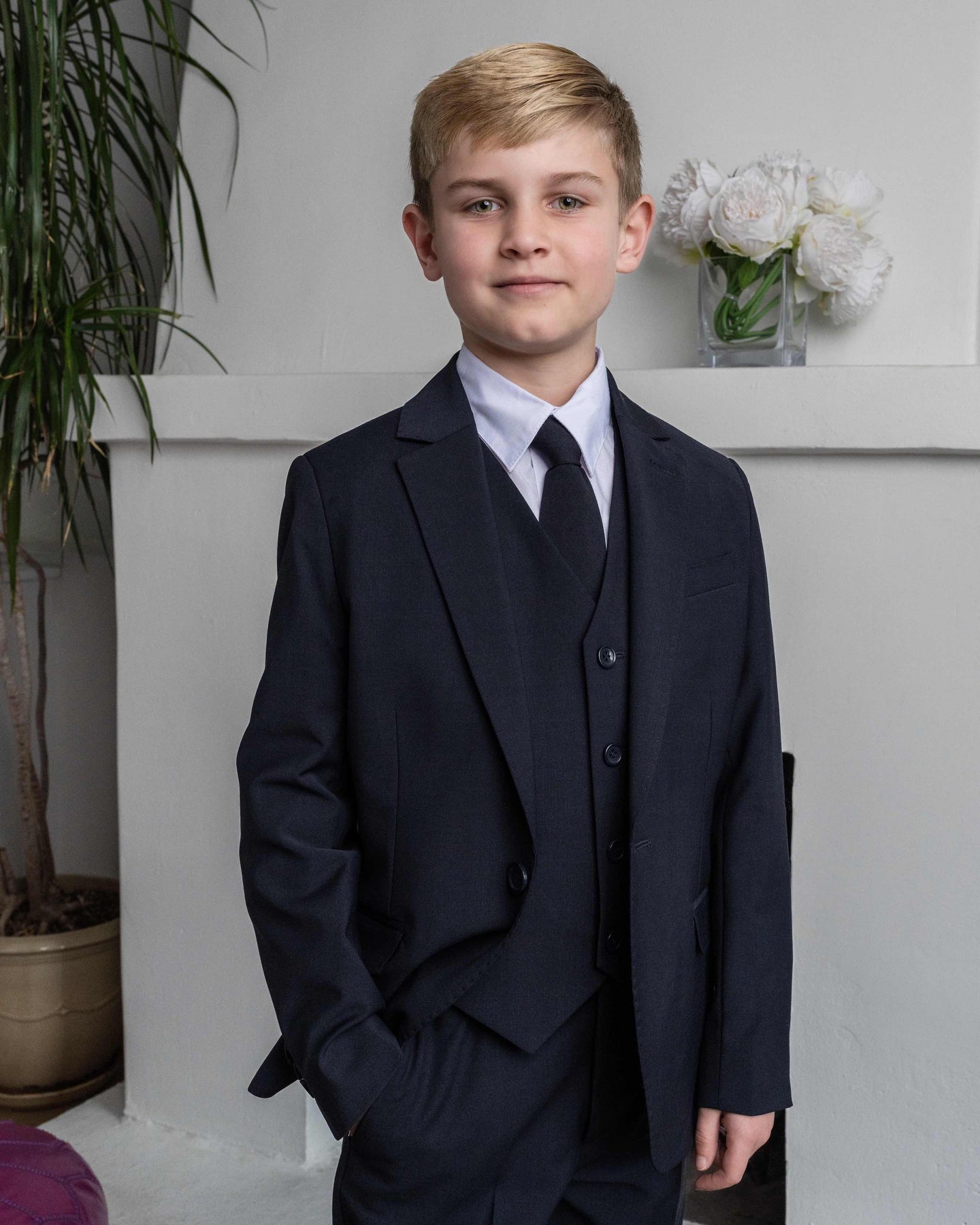 Introduce your child to timeless elegance with the Luxor Midnight Navy Kids Suit. This stunning five-piece ensemble features a rich, deep blue hue inspired by Egypt's modern textile heritage. Crafted from a premium poly-wool blend with Lycra, the suit offers two-way stretch for all-day comfort without compromising style. The collection includes a one-button jacket with pick stitching, matching vest, tailored pants, coordinating long tie, and crisp white shirt—everything needed for ring-bearer duties, weddings, or formal celebrations. The slim fit silhouette ensures your young gentleman looks polished and confident at every special occasion.