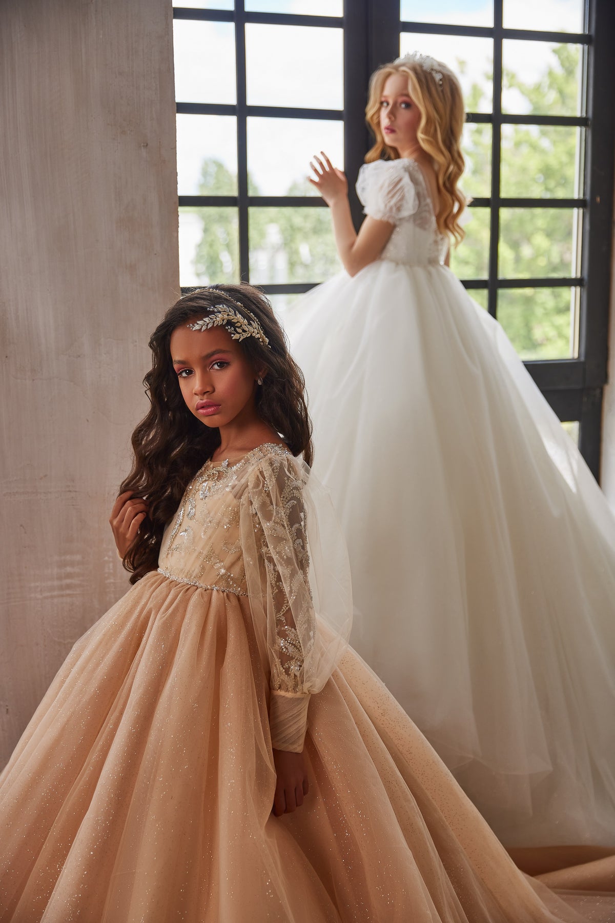 The perfect dress for your little princess! This elegant kids dress is perfect for special occasions. The bodice is intricately embroidered, and the long, flowing tulle skirt will make your little girl feel like a princess. Perfect for weddings, christenings, and other special occasions, your little girl will love wearing this dress.
