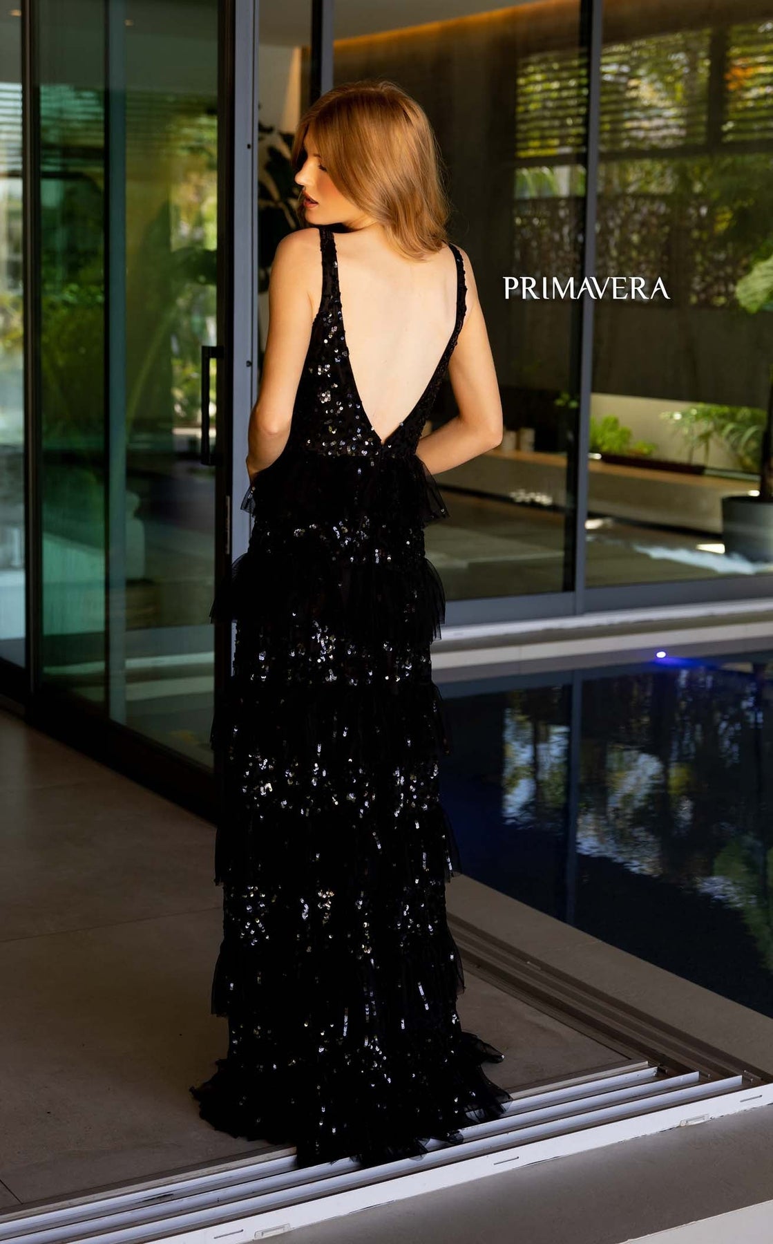 Get ready to turn heads in the Primavera 4142 Dress. Designed for proms and evening events, this stunning long dress features a V neckline and strapped shoulders for an elegant look. The sleeveless design and open back add a unique touch, while the beaded details and slit make it confidently beautiful. Stand out in this special design.