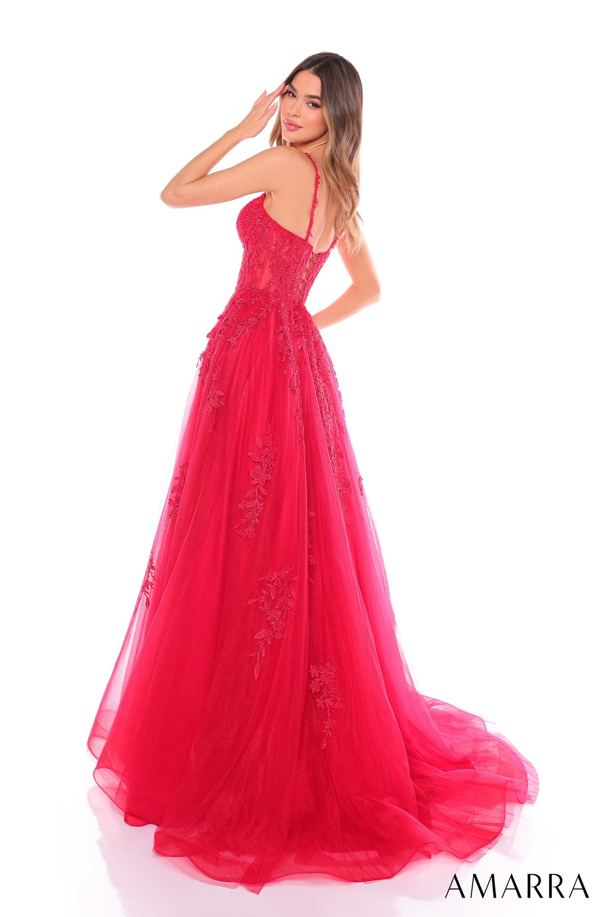 Elegance meets sophistication in this enchanting gown, boasting a full, flowing skirt that exudes timeless charm. Crafted with a sheer layer over a solid base, the skirt gracefully billows from the waist, forming a captivating ball gown silhouette. The fitted bodice features a sweetheart neckline adorned with intricate lace patterns that gracefully cascade down the front, adding a touch of intricate allure. Delicate spaghetti straps offer support to the structured bodice, ensuring a flattering fit and maintaining the dress's enchanting shape throughout the evening. Embellished with delicate lace appliqué that continues across the gown, this dress exudes ethereal beauty, perfect for those seeking a captivating and romantic look for their special occasion.