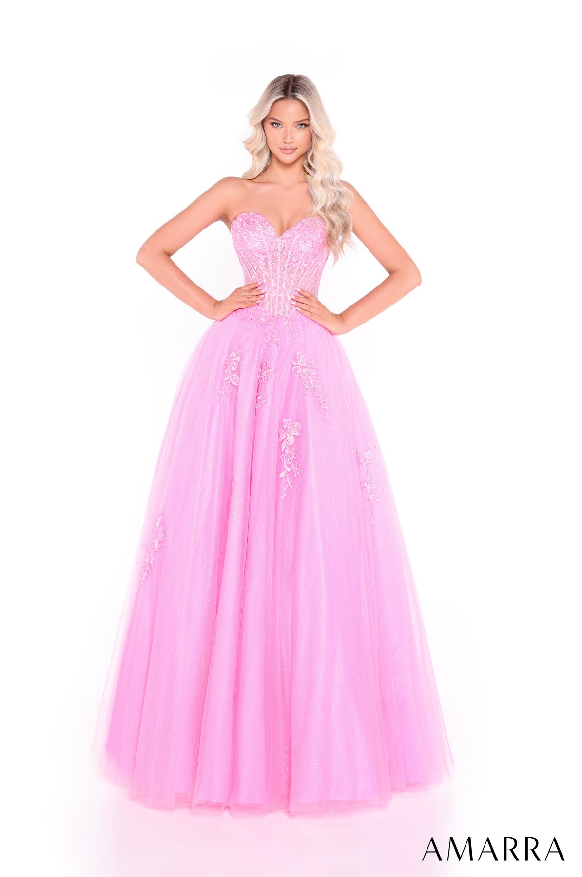 Amarra Sweetheart Ball Gown with Sheer Corset Style 89011 is the dress you wear when you want to feel beautifully noticeable the moment you step into the room. This sweetheart ball gown has a soft, feminine look that still feels strong and well-shaped. The sweetheart neckline curves gently across your chest and helps your upper body look lifted while keeping the front elegant. The neckline frames your shoulders and collarbone in a way that feels graceful and flattering. The sheer corset bodice is designed with lace detailing that shapes your waist clearly and gives your torso a structured look while still feeling light. The corset allows you to stand tall and feel secure as the lace and boning sit neatly against your body. Floral lace accents flow naturally from the bodice into the skirt to create a smooth transition that keeps the look soft. The fitted waist makes your midsection appear smaller, while the corset structure keeps everything comfortably in place throughout the night. Below the waist, the full ball gown skirt opens into layers of glitter tulle. It allows you to move freely as you walk and create a floating effect with every step. The skirt allows the dress to feel airy while still looking full and dramatic. From the back, the lace-up detail ensures a secure fit that enhances your natural shape. The floor-length hem sweeps the floor gently, which makes your posture look taller and your overall silhouette feel elegant and timeless.