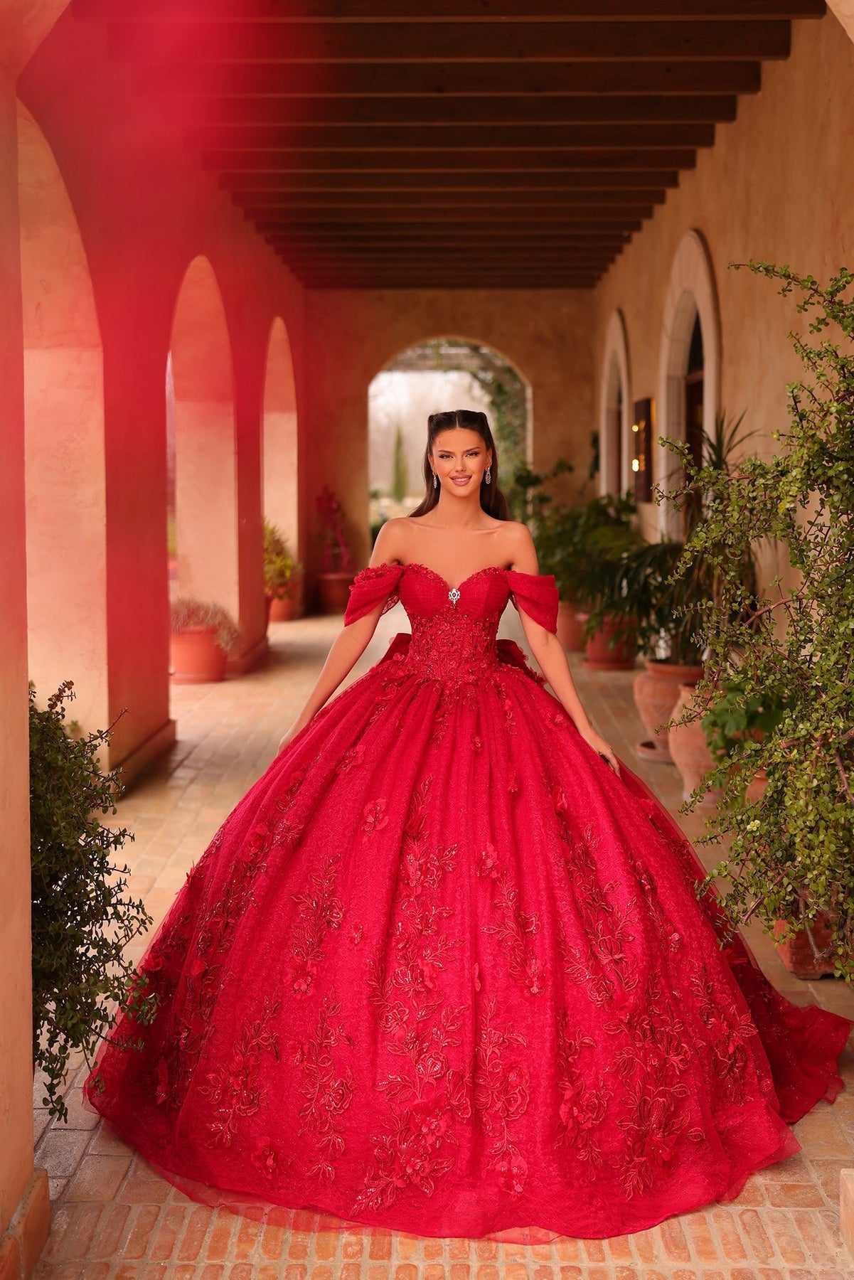 Step into a storybook dream with the Amarra 54119 Dress! This playful quinceañera gown features a sweetheart neckline and off-the-shoulder sleeves that perfectly highlight the beaded corset bodice, decorated with charming 3D floral appliqués. The layered glitter tulle skirt sparkles with embroidered flowers, flowing elegantly to the floor with a lace-up back and a graceful train. Soft, sparkling, and utterly enchanting, this dress turns every moment into a magical celebration.