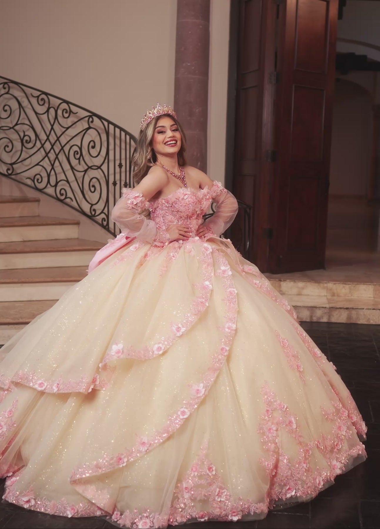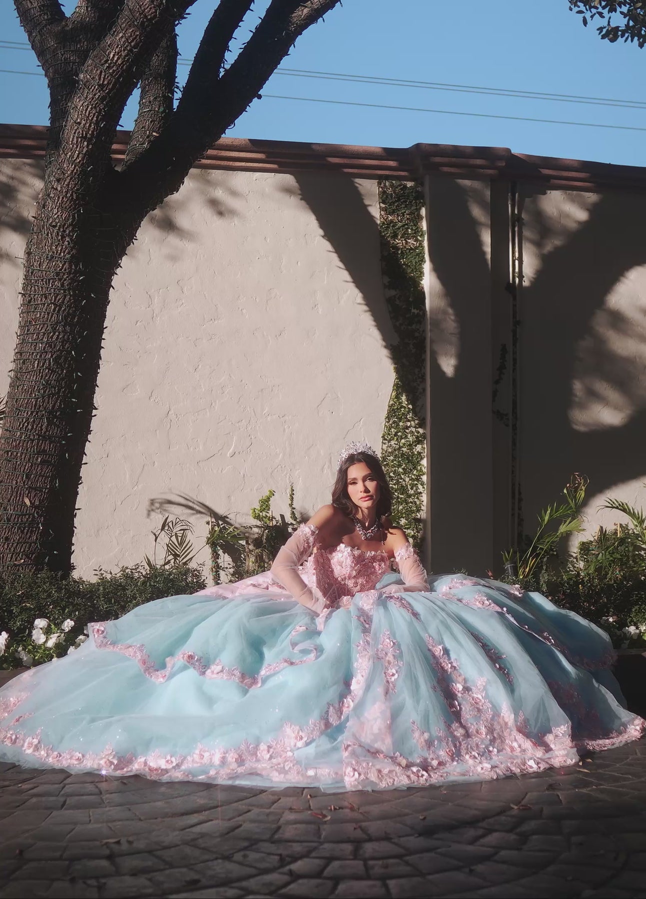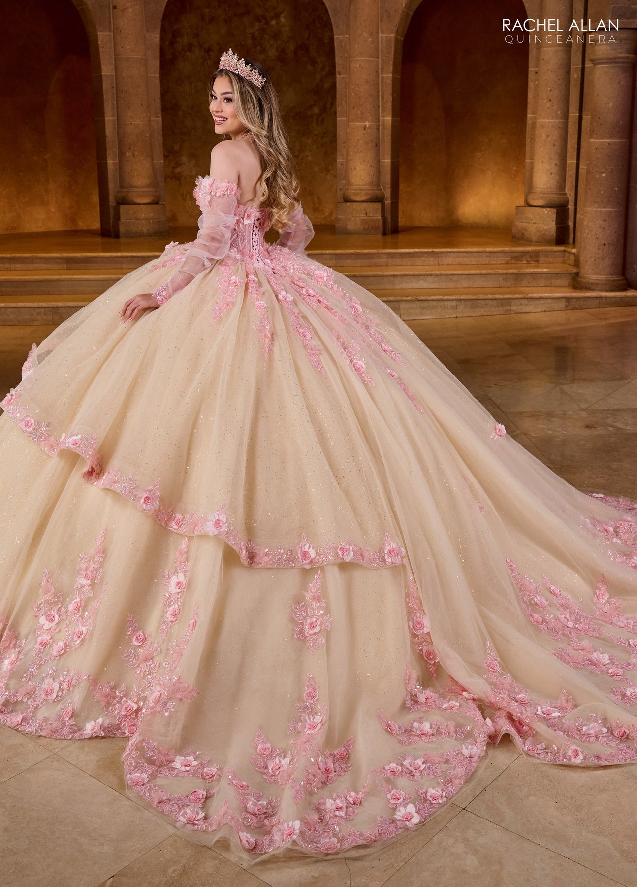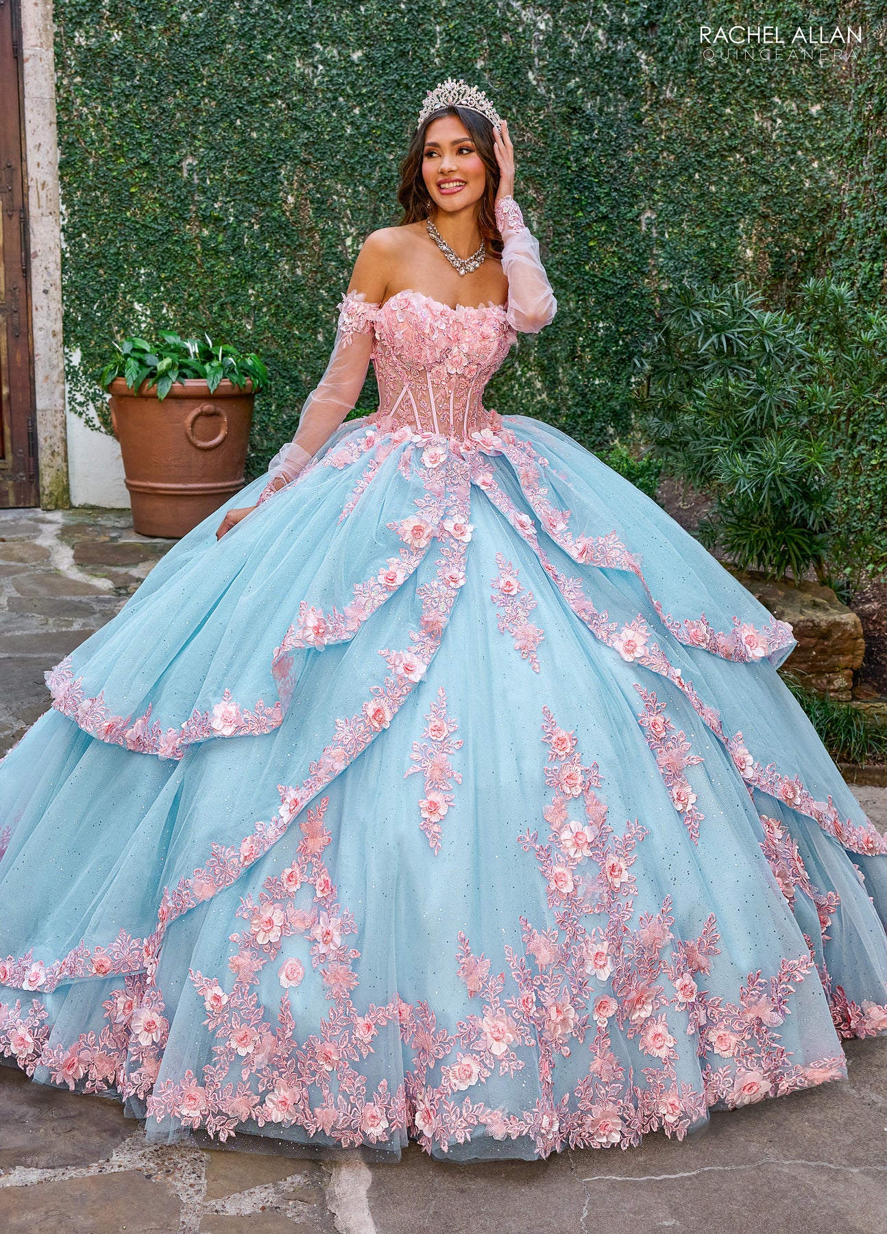 Step into fairy tale dreams with the Rachel Allan RQ2196 Dress—your perfect princess gown! Featuring a sweetheart neckline and off-the-shoulder sleeves, it radiates romantic charm. The bodice dazzles with floral appliqués and sparkling beadwork that gracefully flow into the lush tulle skirt. Soft layers cascade into a full, enchanting silhouette, each tier sprinkled with delicate floral accents. Feel like royalty and twirl into magic with every step!