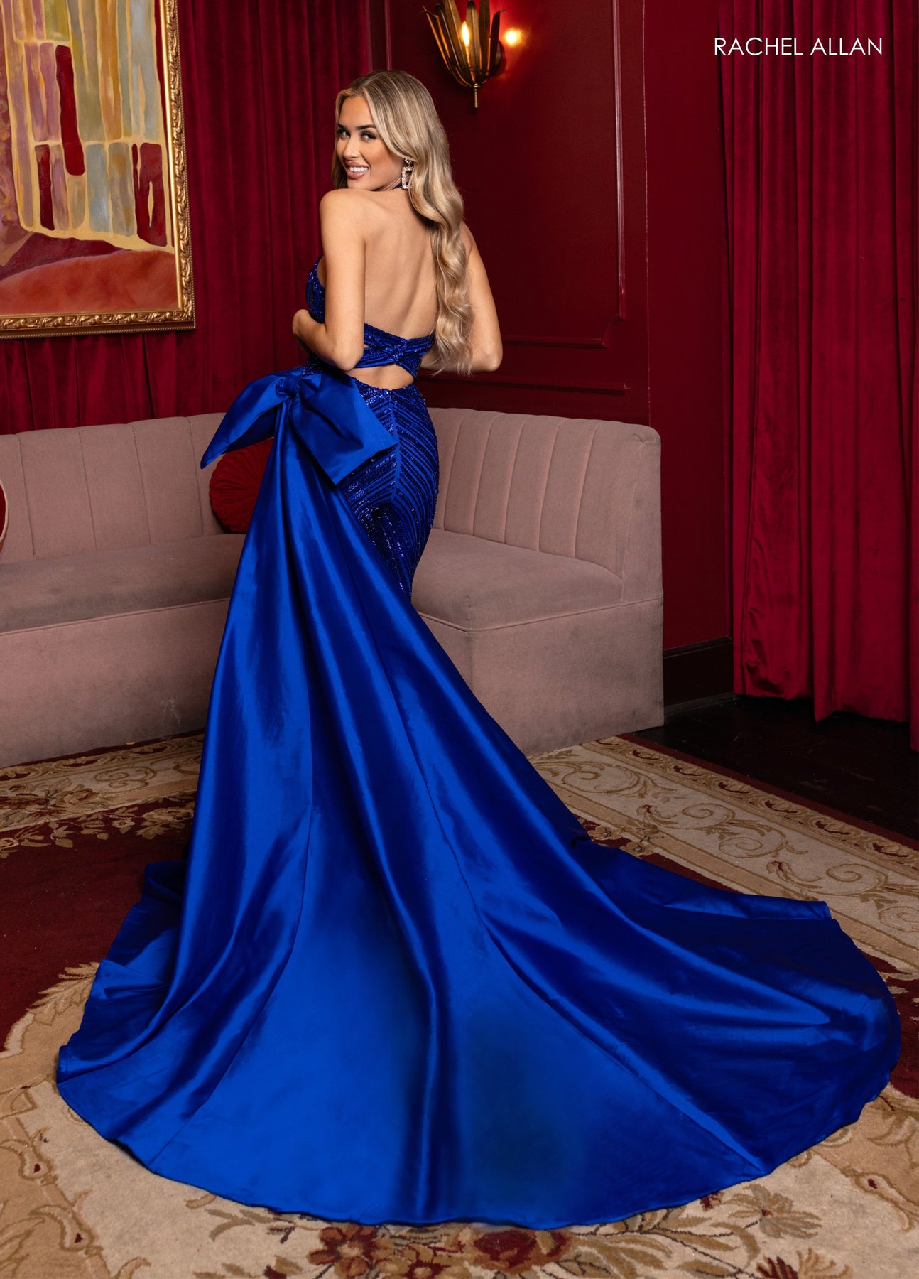 Slay the spotlight in style 50382, a powerful stretch tulle jumpsuit covered in shimmering beading and designed with daring cutouts and a bold halter neckline. A dramatic taffeta overskirt with a statement bow adds volume and regal flair. Available in Royal for rich impact or Black for edgy sophistication—perfect for pageants, runway moments, or commanding any entrance.