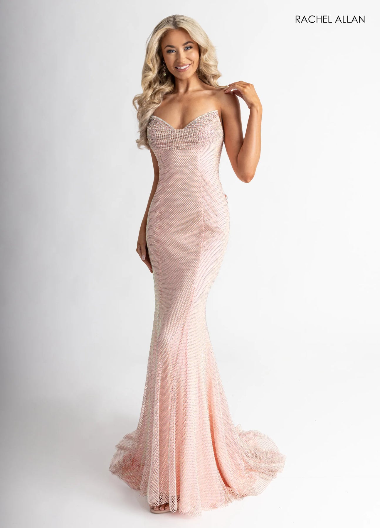 Radiate confidence in this stunning Rachel Allan 70936 gown, where timeless elegance meets modern flair. The crystal mesh fabric drapes beautifully along your curves, while intricate beading catches the light with every movement. A romantic sweetheart bodice and strapless neckline create an effortlessly sophisticated look, perfectly balanced by a charming oversized bow that adds personality and movement. Ideal for proms, galas, or any special occasion where you want to feel absolutely radiant and celebrated.