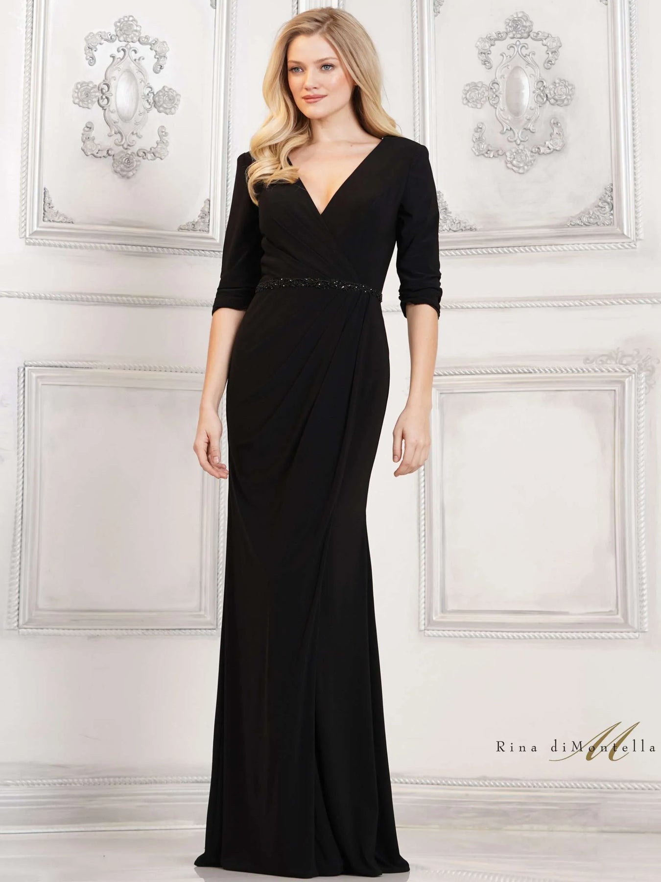 Get ready to dazzle in this V neck ruched bodice matte jersey gown from RINA DI MONTELLA! With a beaded waist line and ruched sleeves, this dress will flatter your figure and make you stand out in any crowd. Perfect for special occasions, this dress is a must-have addition to your wardrobe.