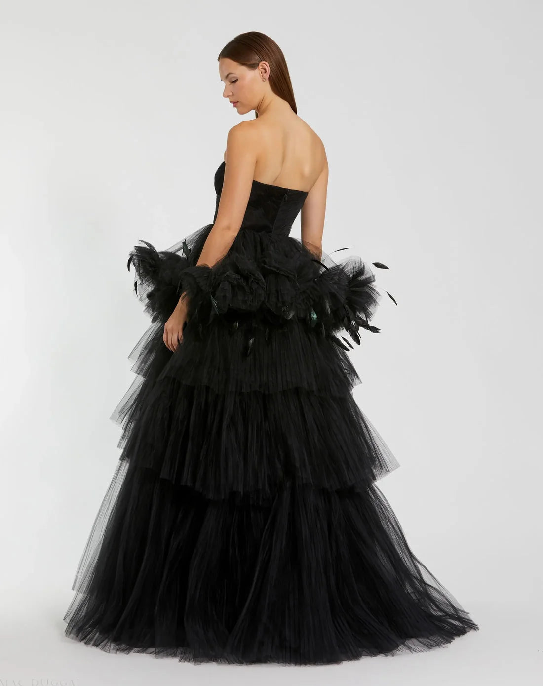 This strapless tulle ballgown features a sheer overlay, sweetheart neckline, and sleeveless design. The pleated bodice with cummerbund enhances the fit, while the ruffle-tiered A-line skirt and feather trim add an elegant, sophisticated touch, making it perfect for any special occasion.