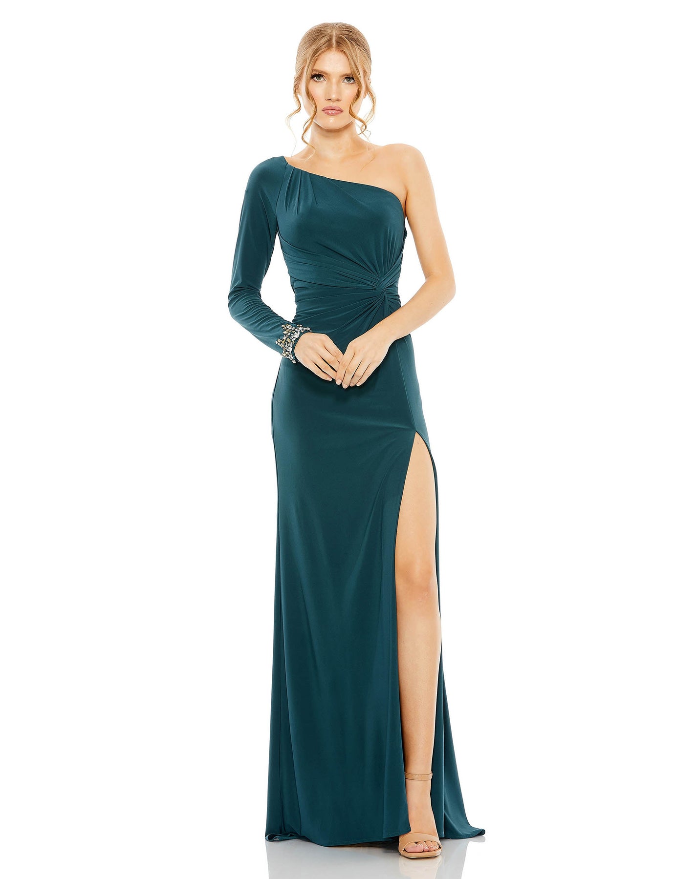 Crafted from smooth jersey fabric, this floor-grazing dress is textured with pleats, an off-center waist twist, and starburst beads and glittering rhinestones at the edge of the single sleeve. A high slit underscores the gown’s sexy and modern styling.