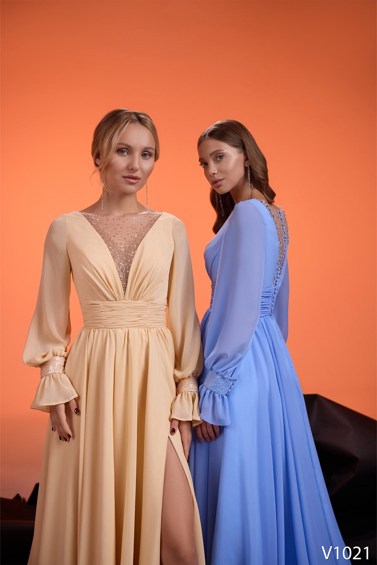 Slip into pure elegance with the Vissaria v1021 Dress, where timeless sophistication meets modern flair. This stunning long dress features a flattering V-neckline and a daring open back that'll have you feeling absolutely fabulous. Long sleeves provide graceful coverage while a high slit adds just the right amount of drama to your stride. Perfect for those moments when you want to turn heads and feel like the best version of yourself. Whether you're heading to a special event or a night out, this dress is your ticket to looking effortlessly chic and undeniably gorgeous.