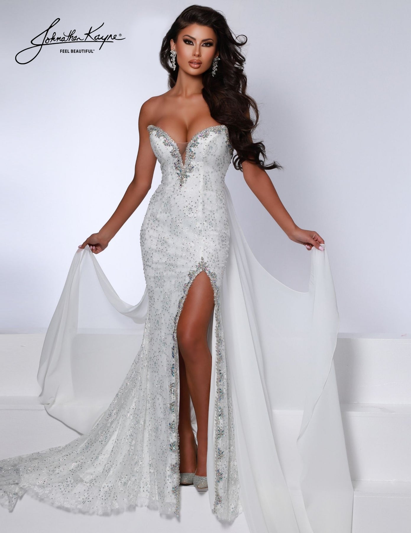 Step into the spotlight with the Johnathan Kayne 2734 Dress! This strapless metallic stretch lace gown hugs your curves while the detachable cape adds a dramatic flair, perfect for turning heads on stage. Designed to make you feel confident and glamorous, it’s your ultimate pageant power piece. Get ready to dazzle and own every moment!