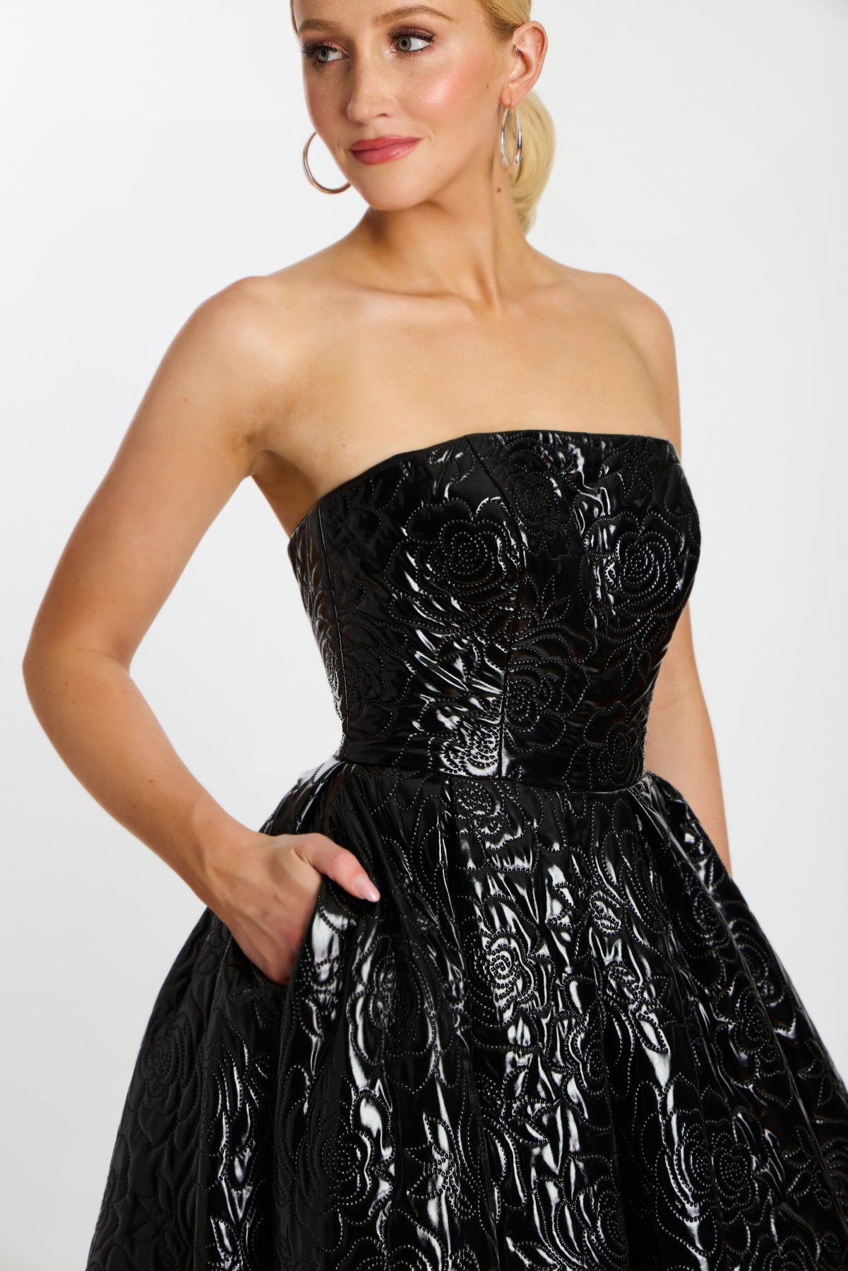 Make a grand entrance in the Jovani 46580 Dress, a strapless ball gown that's pure elegance with a playful twist. The exquisite embossed floral texture adds depth and dimension, creating a look that's both timeless and contemporary. The structured bodice flatters beautifully while the voluminous skirt delivers dramatic flair and movement. This is the dress for those who want to blend traditional glamour with modern sophistication—perfect for formal occasions where you're ready to steal the show with style and grace.
