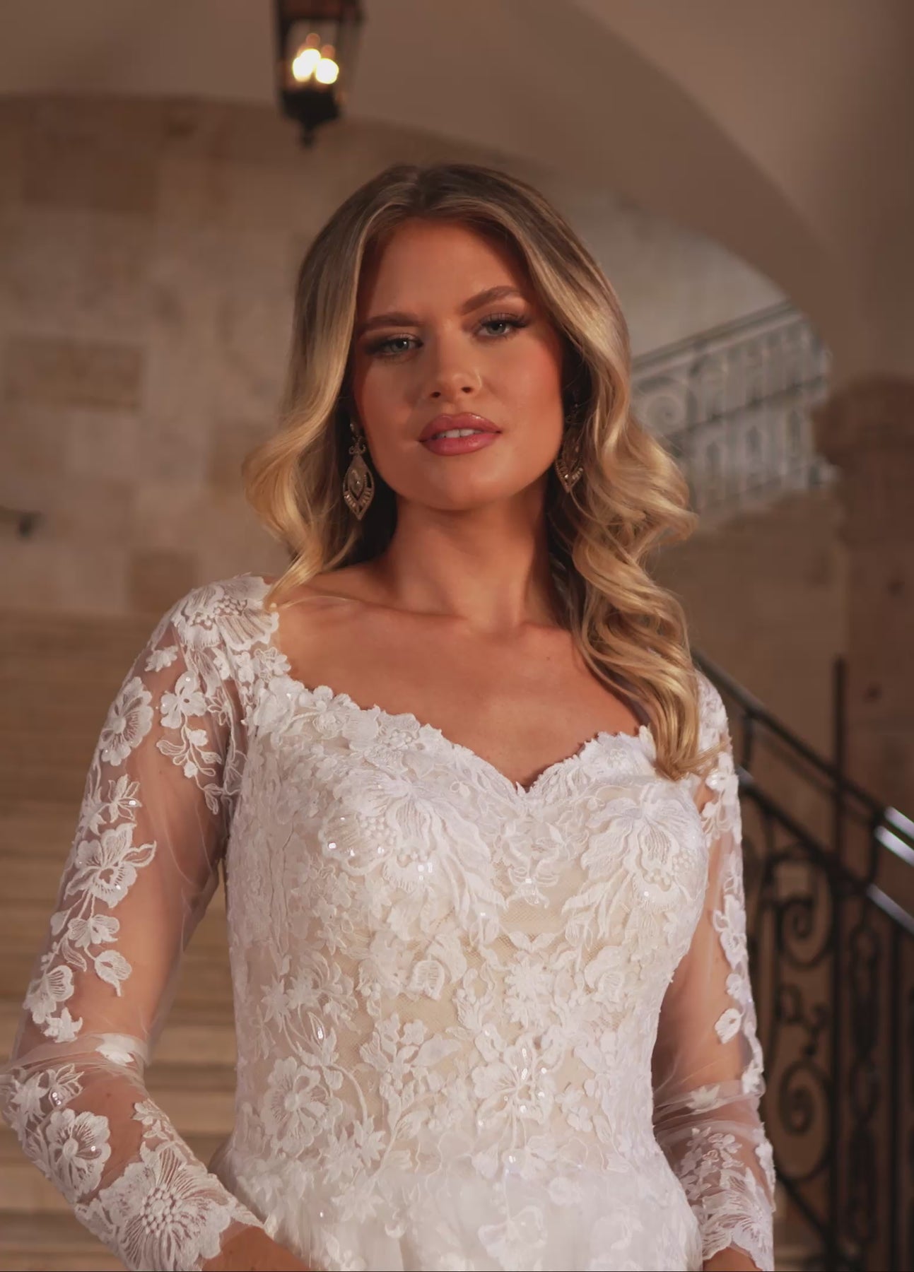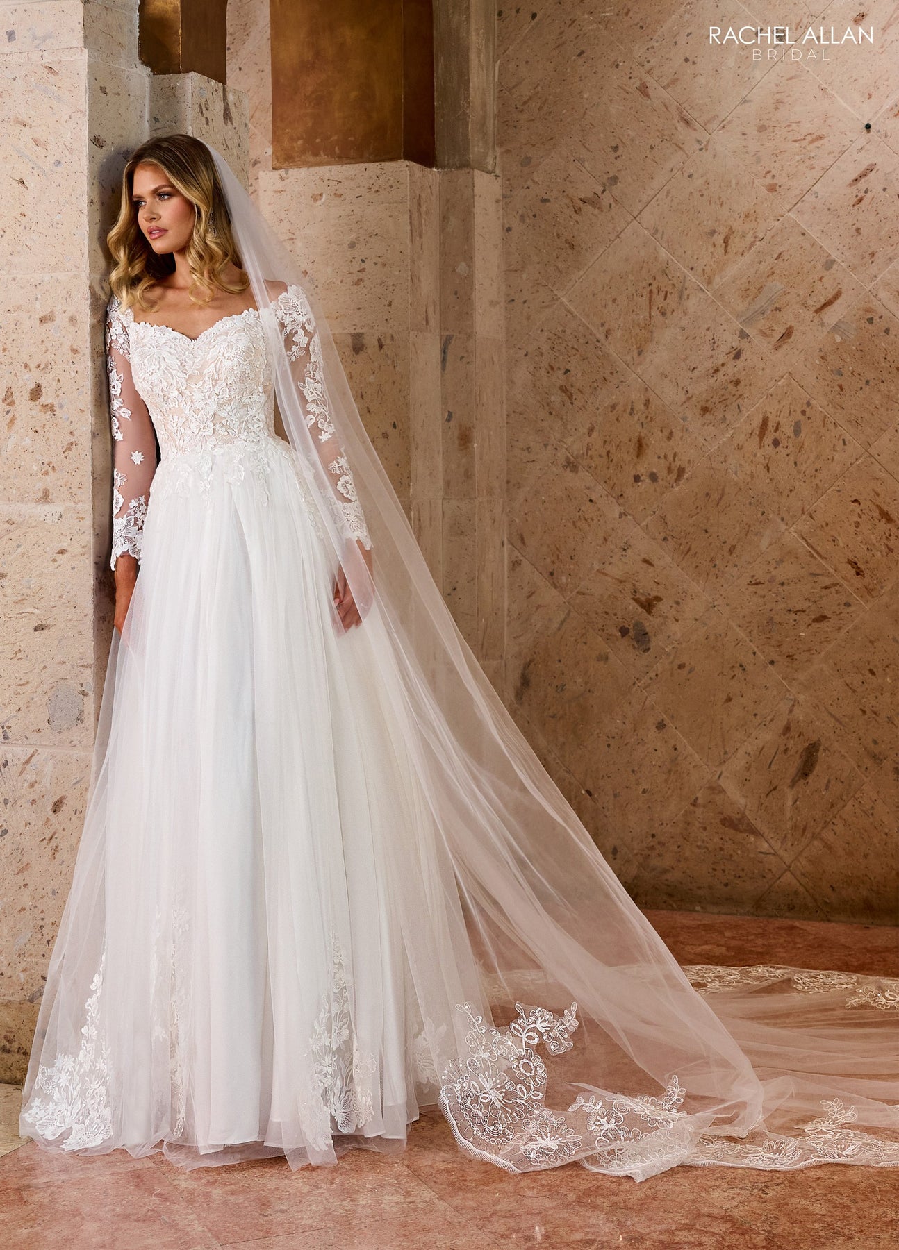 Experience bold elegance with the Rachel Allan RB2186 dress, where soft tulle meets daring design. Its long sleeves and deep V-neckline create a striking silhouette, while delicate floral lace appliqués add intricate detail. The flowing chiffon skirt finishes with a sweeping train, ensuring your entrance is unforgettable and full of romantic drama. This gown blends timeless grace with a fearless edge for the bride who commands attention.