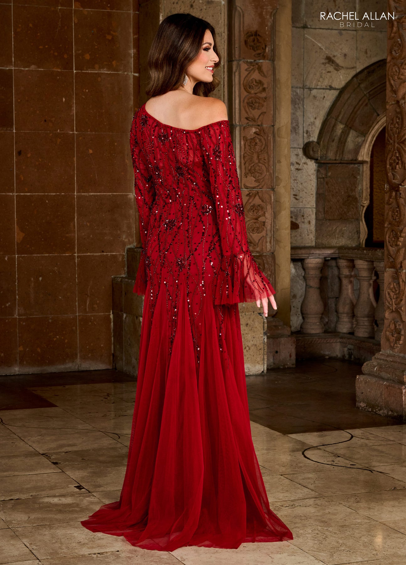 Cut with an edgy asymmetrical neckline and long sleeves featuring flared wrists, this Rachel Allan RB8135 dress commands attention. Intricately beaded and shimmering with sequins, it transforms a sleek silhouette into a dazzling statement. Perfect for the stylish mother who dares to stand out, this gown blends bold design with timeless elegance to ensure she shines at every occasion.